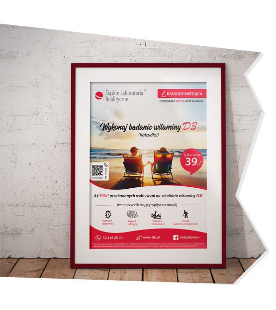 Opracowanie identyfikacji miesięcznej promocji Witaminy D3 oraz wdrożenie na takich nośnikach jak: Plakaty, Vouchery, Fanpage Facebook oraz Landing page na stronie Śląskich Laboratoriów Analitycznych. Kompleksowa obsługa kampanii reklamowej.
